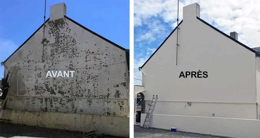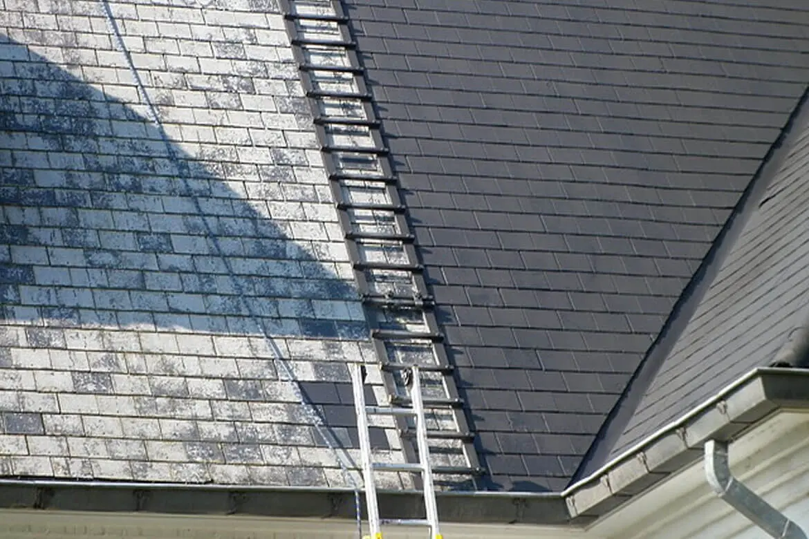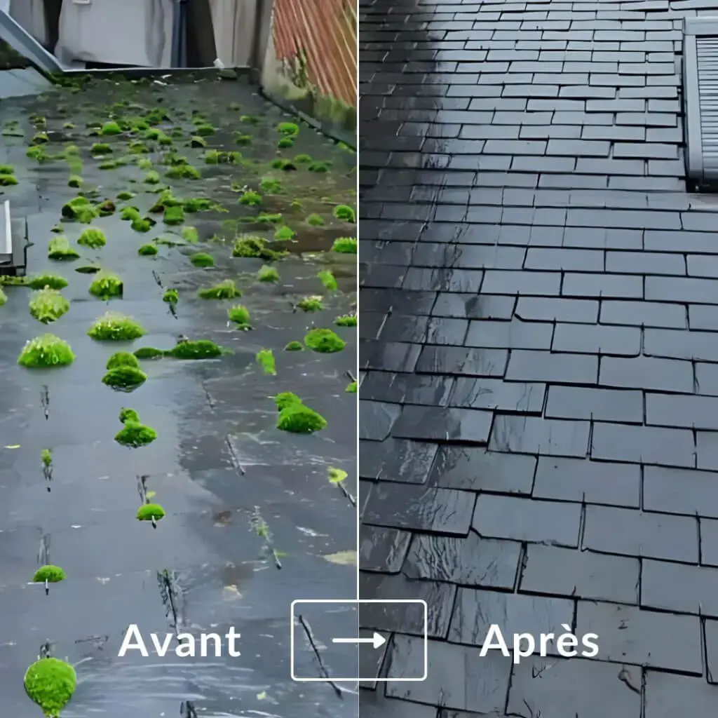 Nettoyage et démoussage de toiture pour éliminer mousse, algues et salissures.
